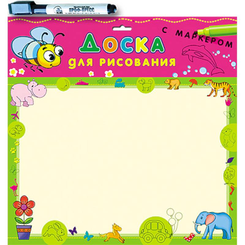 При помощи доски для рисования и прилагающегося к ней маркера Ваш малыш сможет создать любую картину. А начать можно с перерисовывания иллюстраций, расположенных по краям доски. Сначала ребенку можно предложить назвать персонаж или предмет на доске, а затем срисовать его.