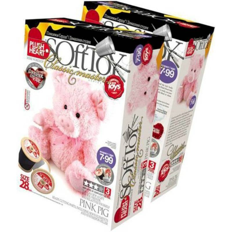 В комплект набора входит: пошитая голова игрушки, 2 лапы, хвост, 4 детали туловища, розовый бантик, синтепоновая набивка, капроновый мешочек с полигранулами, нитки и 'Плюшевое сердце'.