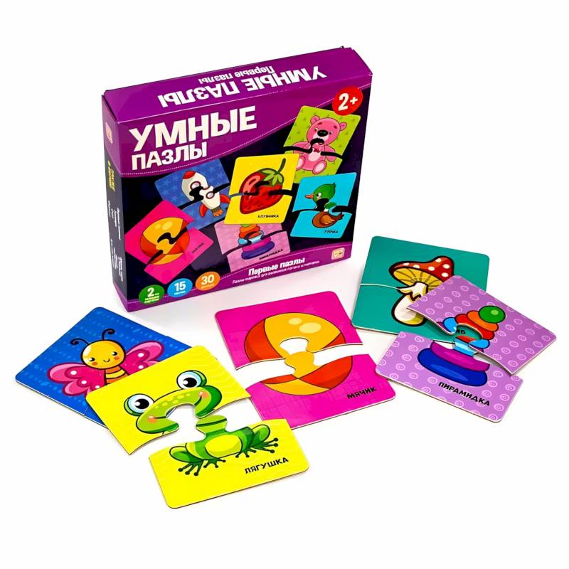 Первые пазлы — это пазлы-парочки для детей от 2-х лет. В наборе 15 пазлов (30 деталей), выполненных из плотного картона, покрытых ВД-лаком, и инструкция с развивающими играми. Пазлы упакованы в коробку.