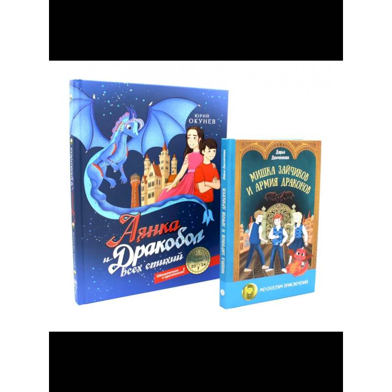В этом комплекте собраны истории о драконах, но герои удивят вас своей непохожестью. В книге Юрия Окунева «Аянка и дракобол всех стихий» огненные существа живут среди людей, а главная героиня учится управлять своими силами, чтобы побеждать в захватывающей игре — дракоболе. Дружба, семья и вера в себя — вот девиз этой книги! А в повести Дарьи Демченковой «Мишка Зайчиков и Армия драконов» обычные школьники невероятным образом сталкиваются с джином, подземной армией драконов и королевой вампиров на пути к Долине Драконов. Вместе эти книги — красочные миры, наполненные магией, отвагой и авантюрами.