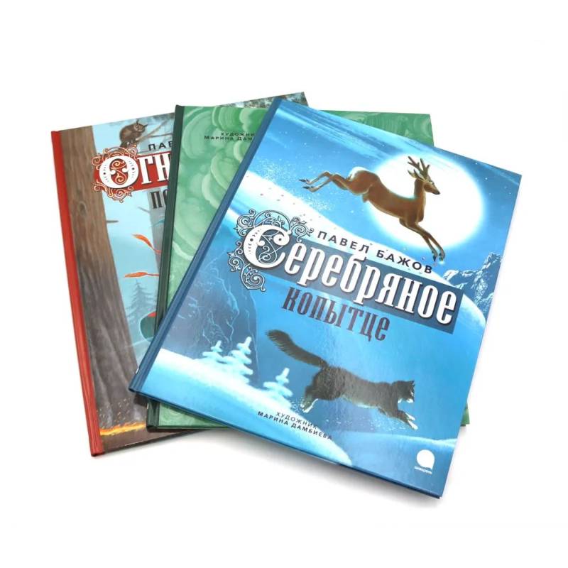 В комплект входят самые известные сказы Бажова: «Малахитовая шкатулка», «Огневушка-поскакушка» и «Серебряное копытце» с замечательными иллюстрациями Марины Дамбиевой.