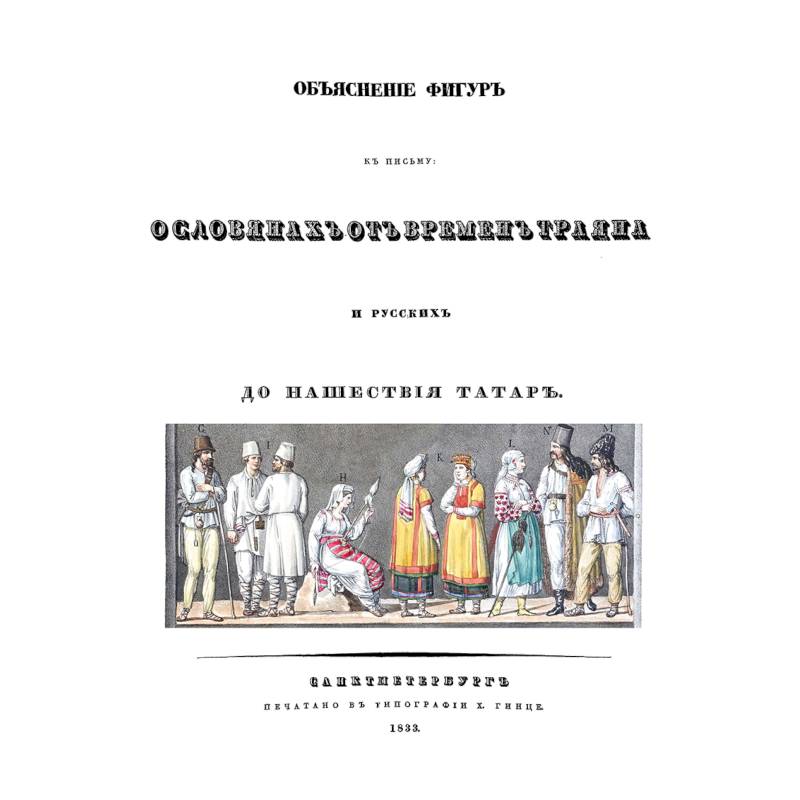 Репринт с издания. Санкт-Петербург, тип. Гинце, 1833. В альбоме 8 стр. объяснительного текста и 15 цветных страниц с многочисленными рисунками. Оригинальное название альбома - Объяснения фигур к письму о славянах от времен Траяна и русских до нашествия татар. Оленин, Алексей Николаевич (1763 или 1764-1843). Это альбом к книге (так же предлагаемой нашим издательством) - Об одежде, оружии, нравах, обычаях и степени просвещения славян от времен Траяна и русских до нашествия татар. Период первый. Письма к г. академику в должности проф. Басину, или опыт к составлению полного курса истории, археологии и этнографии для питомцев С.-Петерб. имп. акад. художеств. Книга изготовлена по технологии 'печать по требованию'. Тираж 30 экз.