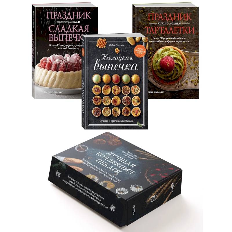 Комплект книг «Лучшая коллекция пекаря» в коробке-шкатулке — ваш идеальный гид в мире выпечки! Мейке Схалинг делится своими нашумевшими рецептами в трех книгах: «Тарталетки», «Сладкая выпечка» и «Несладкая выпечка». Хюгге-формат позволит уместить их даже в небольшую сумочку. Такие рецепты, как киш примавера и пирог волхвов позволят вам удивить себя и близких кулинарными открытиями вне зависимости от повода!