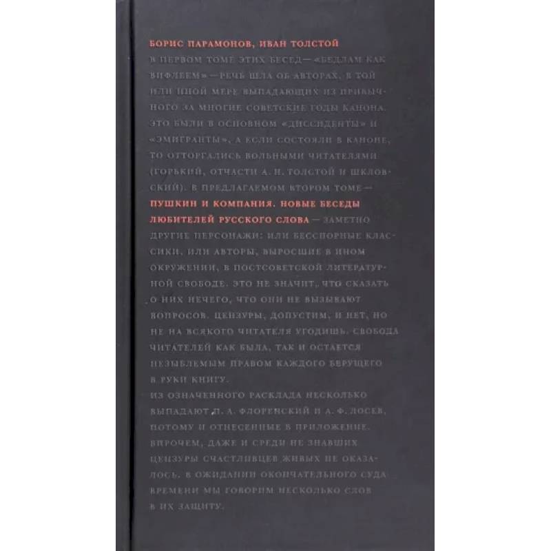 Предмет литературно-философских бесед Бориса Парамонова и Ивана Толстого - русская литература, которую соавторы рассматривают в 'персональных' главах.