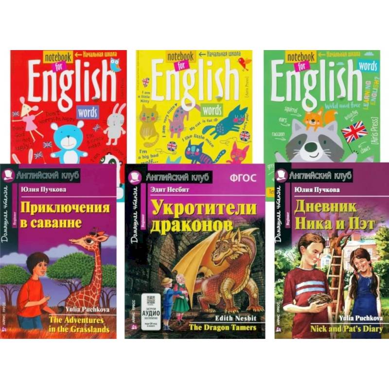В комплект вошли три тетради для записи английских слов и три книги уровня Beginner на английском языке: