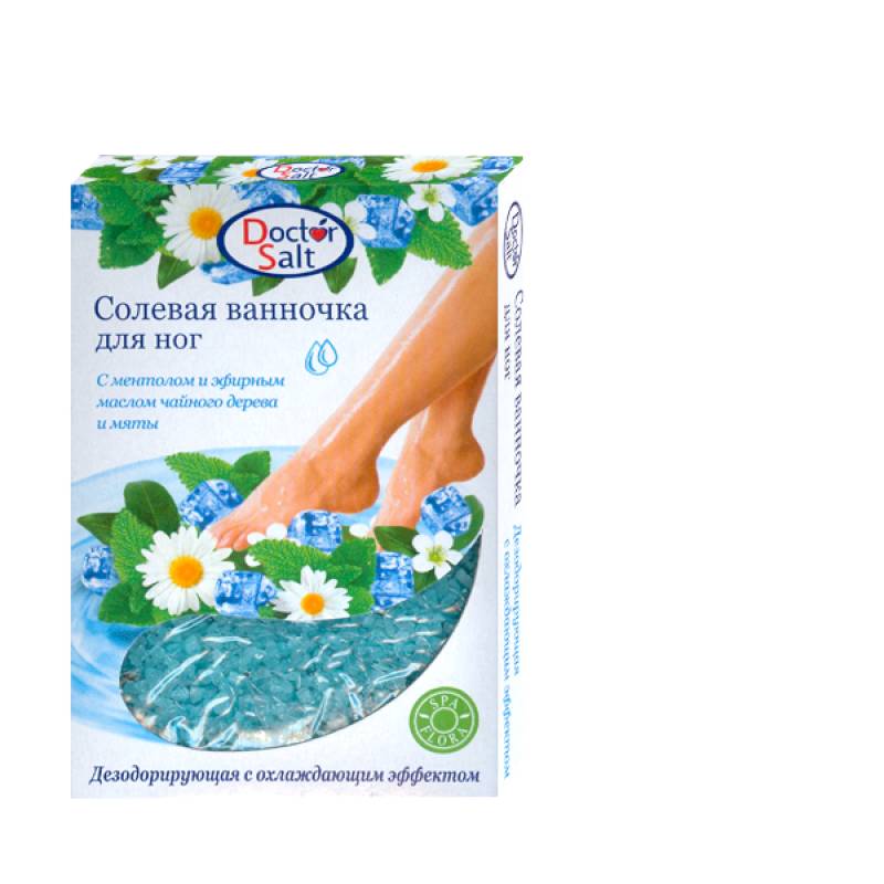 Солевая ванночка для ног дезодорирующая с охлаждающим эффектом. Морская соль с растительным экстрактом ромашки, ментолом и эфирным маслом чайного дерева и мяты при комплексном уходе за ногами быстро снимет усталость, тонизирует и освежает кожу ног, а так же обладает охлаждающим эффектом.