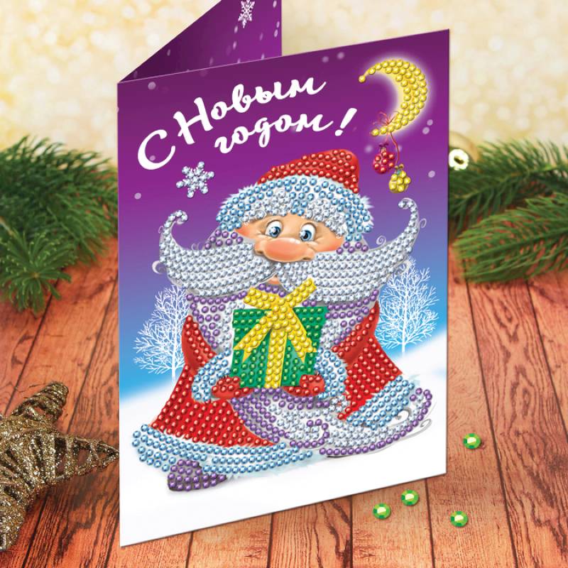 —Алмазная вышивка на открытке 'Дед Мороз' + емкость, стержень с клеевой подушечкой