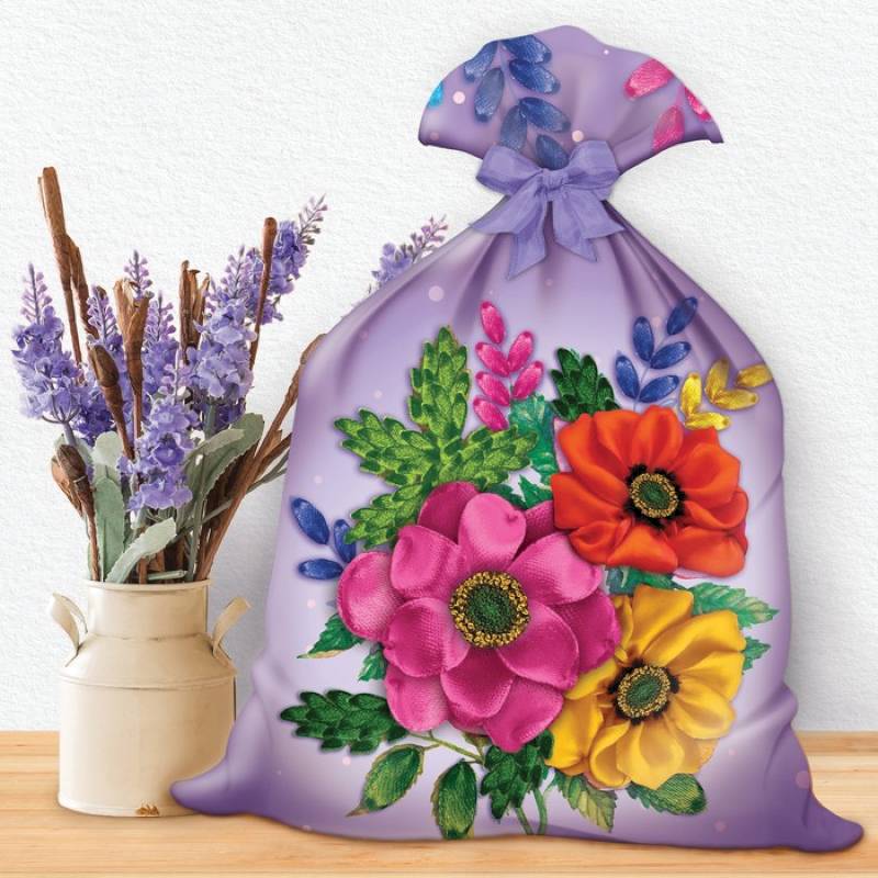 Вышивка лентами на мешочке 'Жостово',...